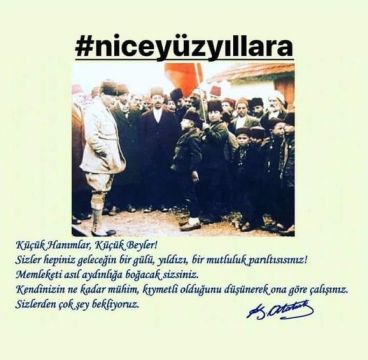 BUGÜN 23 NİSAN.![]() Tarihimizde önemli bir dönüm noktası olan 23 Nisan 1920, Türk milletinin var olma- yok olma mücadelesinde kendi azim ve kararlılığıyla çözüme ulaşmasının, netice almasının en büyük örneklerinden birisidir. Türkiye Büyük Millet Meclisinin (TBMM) kuruluşunun ve 23 Nisan Ulusal Egemenlik ve Çocuk Bayramının bu yıl 101. Yılı Ulu Önder Mustafa Kemal Atatürk’ün Aydınlık geleceğimizin güvencesi Çocuklarımıza armağan ettiği 23 Nisan Ulusal Egemenlik ve Çocuk Bayramı, çocuklarımızın ve milletimizin 23 Nisan'ı şen şakrak, cıvıl cıvıl, rengarenk bir ortamda kutlamaları dileği ile bütün çocuklarımızın ve ülkemizin 23 Nisan Ulusal Egemenlik ve Çocuk Bayramı kutlu olsun. Çerkeş Dernekler Federasyonu (ÇER-DEF) |